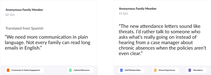 Collect staff and family perspectives from community pulse check-ins, messages, and existing feedback — all in one place.